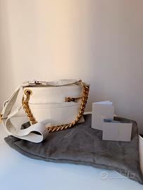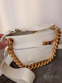 Tom Ford Chain Hobo Bag in pelle bianca – Come nuova con accessori originali Elegante e sofisticata borsa a spalla Tom Ford in pelle bianca liscia di altissima qualità. Modello iconico con la caratteristica catena gold chunky che dona un tocco luxury e glamour unico. Dettagli: • Pelle bianca morbida e lucente • Catena dorata removibile e regolabile • Tracolla in tessuto bianco con logo Tom Ford ripetuto (regolabile e removibile) • Zip frontale con charm dorato • Logo Tom Ford impresso a rilievo sulla fascia frontale • Interno spazioso con fodera in tessuto La borsa è in condizioni eccellenti, praticamente come nuova, acquistata da poco e usata pochissime volte. Completa di tutto: • Dust bag grigio originale Tom Ford • Card holder / booklet Tom Ford • Tag originale con barcode Dimensioni approssimative: Circa 25 cm (larghezza) × 18 cm (altezza) × 8 cm (profondità)