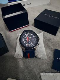Vendo orologio Tommy Hilfiger Clark ⌚ Orologio in stile sportivo ed elegante, con quadrante blu e dettagli iconici rosso/bianco del brand. Dotato di cronografo con tre sotto-quadranti e cinturino in silicone blu molto comodo da indossare. ✔ Movimento al quarzo preciso ✔ Cassa grande e moderna ✔ Vetro resistente ✔ Adatto sia a look casual che più eleganti 💎 Condizioni: poco usato, praticamente come nuovo 📦 Completo di scatola originale Perfetto anche come idea regalo! 📩 Contattami in privato per info o prezzo