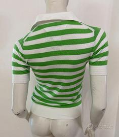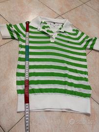 Maglietta a manica corta, estiva, modello polo con bottoncini nella scollatura, bianca e verde a fantasia righe. Taglia XS, le misure in cm sono riportate in foto. 50% Lyocell, 30% Cotone, 20% Viscosa. Condizioni ottime. Contattatemi per ulteriori informazioni.