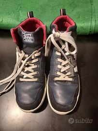 scarpe alte in pelle blu nere bianche con lacci e cerniera laterale x una calzata più veloce. non trovo il numero però la suola interna è 25 cent. corrispondente al n.39 usate poco. pulite.