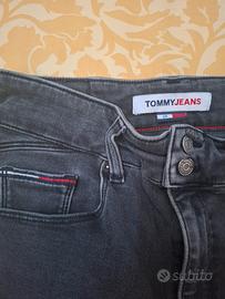 Tommy Hilfigher jeans donna/ragazza originali, taglia W28-L30, colore grigio antracite, 89% Cotone, 6% Poliestere, 5% elastane, chiusura frontale con cerniera e doppio bottone, patch Tommy Jeans posteriore, iconico logo Tommy anche sul taschino frontale. Indossato solo 2 volte, in perfetto stato come da foto, pagato in negozio € 99,90.