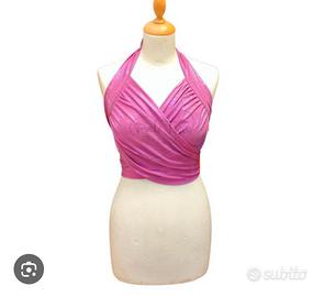 Top a fascia in lycra lurex dorato, scollo a v, incrociato a livello del petto, da annodare dietro la schiena.