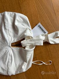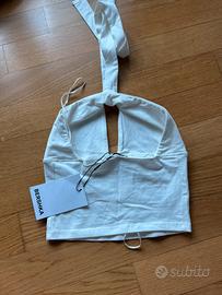💫Super trendy e perfetto per l’estate! Top corto bianco in cotone elasticizzato, con scollo a V e dettaglio con nodo centrale. Modello con spalline sottili ed elegante apertura frontale. La fascia da annodare dietro il collo dona un tocco originale e valorizza il décolleté. Vestibilità aderente ma comoda. 🔹 Condizione: Nuovo, mai indossato, con etichetta 🔹 Perfetto per festival, serate estive, vacanze o look da giorno casual-chic. 💬 Scrivimi per info o altre foto!