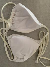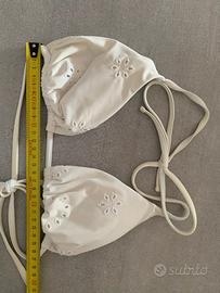 Top bikini bianco a triangolo con dettaglio traforato floreale tipo sangallo.