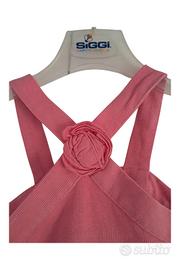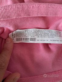 Top estivo bambina taglia 10 anni, in cotone elasticizzato, colore rosa acceso. Modello incrociato sul retro con dettaglio floreale centrale, comodo e leggero, ideale per le giornate calde. In ottime condizioni, usato pochissimo. Perfetto con shorts, gonne o jeans.