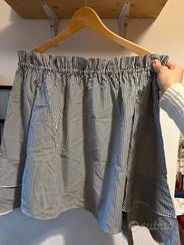 La camicetta ha un designcon spalle scoperte e maniche lunghe svasate con bordi ricamati, un motivo a righe verticali bianche e grigie.