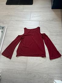 Vendo questo top Bershka in taglia S, mai indossato. È di colore bordeaux, con spalle scoperte e maniche a campana, perfetto per un look elegante e femminile. Il tessuto è morbido e leggero, ideale per diverse occasioni.