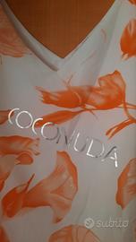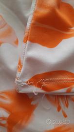 Particolare top Coconuda ragazza, veste taglia M anche se la targhetta riporta XL. Colore bianco con stampe arancio e scritta argentata sul petto, scollatura a V davanti e dietro, con fodera oer evitare trasparenza, elegante e pratica. Unico difetto visibile nell'ultima foto (un filo della cucitura leggermente sfilato).