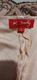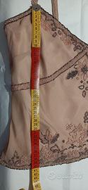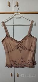 Elegante top da donna con dettagli ricamati. Tessuto leggero color beige dorato. Decorazioni con perline e paillettes. Spalline sottili. Tutto foderato.Misure nelle foto in allegato all' annuncio.
