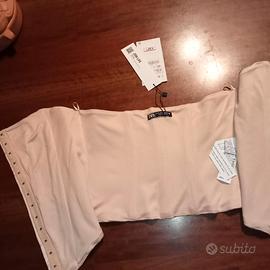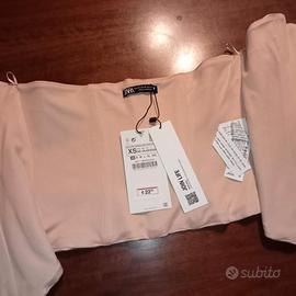 Top satinato Zara con scollo a cuore e spalle scoperte. Chiusura anteriore con gancetti metallici. Taglia xs, colore rosa quarzo. Nuovo con etichetta.