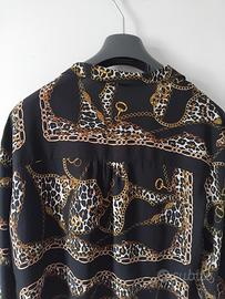 Sfondo nero con stampa dorata. Maniche lunghe, ampio scollo a V. Taglia S