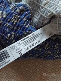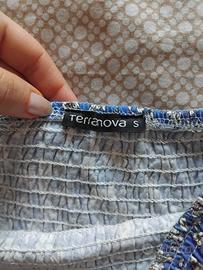 vendo top corto a maniche corte blu con fiorellini bianchi, adatto con gonne/pantaloni a vita alta. Marchio: Terranova. Taglia: S. Usato poco, vendo causa inutilizzo