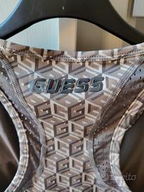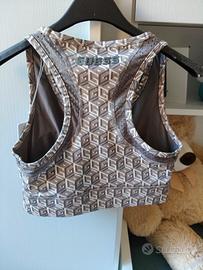 Reggiseno sportivo Guess Activewear. Con logo in rilievo sul retro. A fantasia. Colore marrone e beige. Coppe rimovibili. Nuovo con cartellino. Taglia XS.