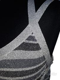 Realizzato in viscosa e lurex nei colori grigio, bianco, nero, lavorazione a costine e quindi lo rende elasticizzato.