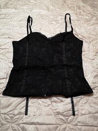 Top di pizzo nero con spalline regolabili, un fiocco di raso al centro del petto e due in fondo ai lati. Completamente foderato e cerniera sul retro. Taglia M.