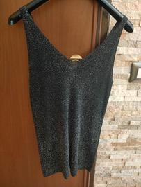 Top donna nero senza maniche con scollo a V e strass applicati su tutto il tessuto.Molto morbida. Veste s/m Lunghezza 64 cm