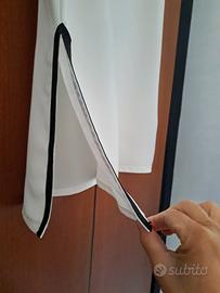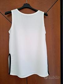 Top smanicato, spalla larga, scollo tondo , leggermente over , colore latte/panna , con spacchi laterali a contrasto di colore nero. Tg. M , brand Kokka. Capo versatile, sia casual che elegante per occasioni speciali . Indossabile nelle quattro stagioni. Vendo a 15 euro , pari al nuovo e ben conservato.