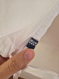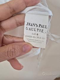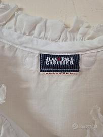 Top donna vintage Jean Paul Gaultier taglia S, colore bianco, tessuto ramie simile al lino. con piccole rouches sul giromanica e girocollo, con stringa sul davanti e coulisse alla base del top. L'etichetta è rovinata come evidenziato in foto, la R del logo si intravede. C'è una piccola macchiolina evidenziata in foto va via con il lavaggio Vi lascio le misure da ascella ad ascella: 54 da spalla a spalla: 44 lunghezza: 52