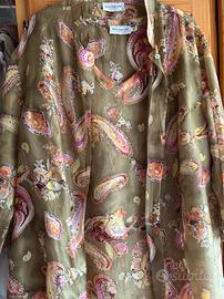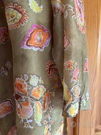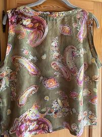 Top e camicia in seta vintage (anni '90) fantasia paisley su sfondo verde. Il top è senza maniche, la camicia invece ha maniche lunghe, colletto alla coreana e spacchetti ai lati. Entrambi leggerissimi, molto belli.