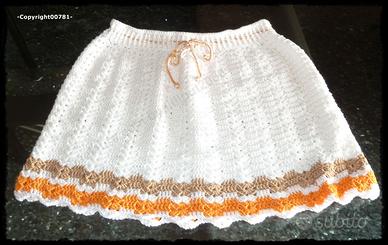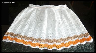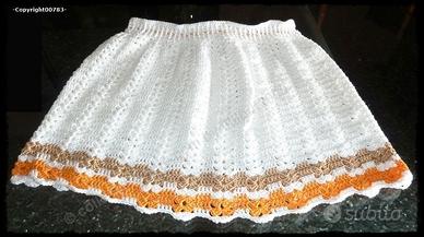 MINIGONNA, una gonnellina che si stringe e si allarga alla vita per mezzo di un cordoncino, sempre fatto ad uncinetto. Capo coprente, leggero e molto morbido, da sfruttare per tutta l’estate, indicato soprattutto per mare o montagna.