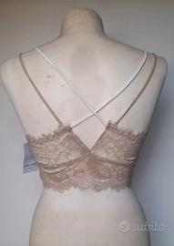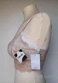Top con bralette in merletto elasticizzato, floreale nei toni del beige e bianco. Modello comodo ed elasticizzato, ideale sia come capo intimo, top da abbinare sotto giacche o camicie trasparenti e danza.