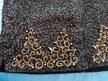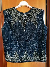 Bellissimo top sartoriale con piccoli spacchetti laterali. Tessuto di pailletes nero con ricami dorati rifiniti da piccole pietre dorate. Leggermente avvitato e foderato.