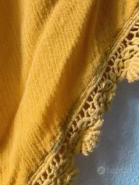 Top corto giallo con dettagli in pizzo sulle maniche - Tessuto leggero e arricciato - Scollo ampio - Orlo elasticizzato Taglia S. Possiedo tre top uguali di color giallo (quello in foto) e bianco. Quelli bianchi sono una S e una M