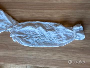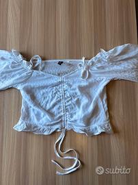Top bianco crop con maniche lunghe in stile boho chic. Tessuto leggero e morbido, perfetto per la primavera/estate. Dettaglio arricciato frontale regolabile con laccetti. Spalle scoperte con elastico per una vestibilità comoda e femminile. Ideale da abbinare a jeans a vita alta o gonne.