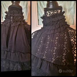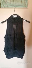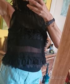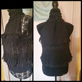 Elegante top in pizzo nero Sisley, perfetto per aggiungere un tocco di raffinatezza. - Design senza maniche con scollo all'americana. - Collo alto con volant. - Dettagli in pizzo floreale. - Sovrapposizioni di tessuto trasparente e pizzo. L'etichetta interna è stata tolta perché trasparire. Condizioni ottime. Lunghezza dal collo 62 cm, da ascella ad ascella 45 cm.