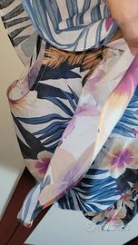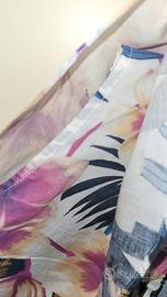 Bellissimo questo top in cotone con motivo floreale, nelle tonalità del fucsia, beige e azzurro, arricchito con volà che gli danno un tocco di eleganza. È arricciato in vita e leggermente scollato sul retro. Era abbinato ad un pantalone fucsia (vendibile a richiesta), ma sta bene anche col beige e col blu. Indossato 2-3 volte da una ragazzina di 12-13 anni con corporatura nella media