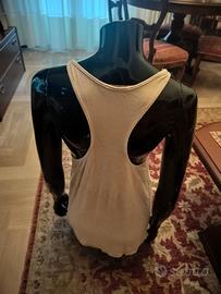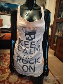 Top lungo made in Italy indossabile anche come miniabito del brand Blue Joint Collection .In seta,cotone e viscosa con bella stampa di un teschio incoronato al di sopra della scritta "KEEP CALM AND ROCK ON".Lo scollo può trasformarsi anche ad anello o allargato fino a lasciare le spalle nude in maniera molto sensuale.Color rosa cipria.Taglia S .Dimensioni : 46 cm larghezza spalle, 46 cm larghezza sotto ascelle, 62 cm lunghezza totale.Ottime condizioni .Possibile consegna a mano ad Arcore,Monza,Sesto e a Milano