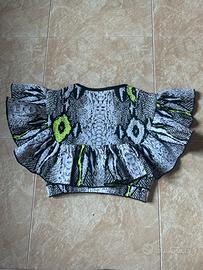 Top corto originale Mangano, taglia XS, con maniche volant e stampa animalier in bianco, nero e verde fluo.