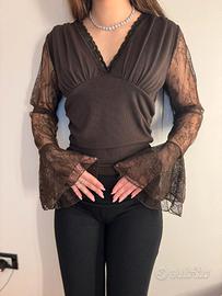 Il capo presenta una texture a costine sul corpo e splendide maniche lunghe in pizzo trasparente con finale a campana.
