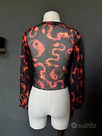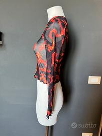 Maglia in tessuto mesh semi-trasparente nera con stampa draghi effetto fiamma rosso fuoco. Vestibilità aderente, maniche lunghe leggermente svasate e fondo ondulato super carino. alt / goth / grunge y2k serate, concerti, outfit bold Condizioni ottime nessun difetto evidente.