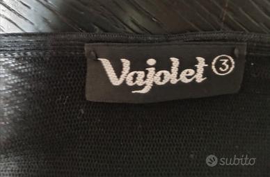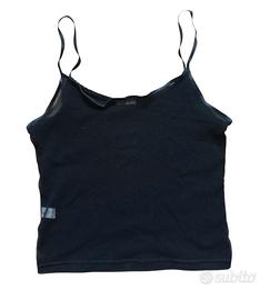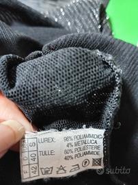Top nera del brand italiano Vajolet, caratterizzata da un elegante effetto luminoso grazie al tessuto in lurex argentato. Bretelline sottili e trama a righe orizzontali glitterate. Taglia 3 , Si. Il tessuto è leggermente elasticizzato, molto confortevole. Perfetto per una serata speciale o come sottogiacca elegante. Ottime condizioni Lunghezza: 46 cm Ascella ad ascella: 36 cm Spalle: