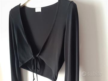 Top nero a maniche lunghe firmato Motivi, made in Italy. Tessuto elasticizzato (93% poliestere, 7% elastan) – morbido e aderente. Taglia italiana 42 – vestibilità aderente, ideale per taglia S/M. Modello corto (crop top) con scollo a V e laccetti sul davanti. Maniche lunghe leggermente svasate sul fondo. Perfetto per look da sera o casual chic. Condizioni: Ottimo stato, usato pochissimo. Nessun difetto visibile o segno d’usura.