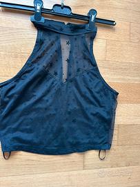 Bellissimo top in tulle nero trasparente decorato con stelline tono su tono ⭐️. Perfetto per un look audace e trendy: ideale da abbinare con un reggiseno a vista, una bralette oppure sotto una giacca in pelle per un outfit da sera 🔥