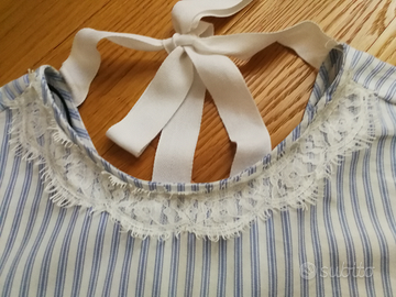 Top Zara Nuova, mai indossata ma senza etichetta. Perfetta, Nessun difetto o rottura. Grazie taglia S, comoda dal fit leggermente svasato. Manica 7/8, scollo a giro ampio, fiocco dietro, pizzo 3 verticale sull' azzurro Baby (riga Lavorata non stampata), manica all' orologio, sul finale svasata leggermente a sbuffo. Tutti i dettagli la rendono romantica dallo stile Bohémien. Perfetta con un jeans Bianco o uno shorts.