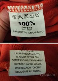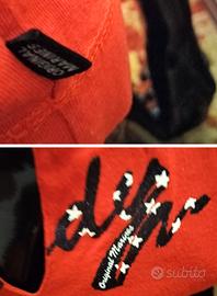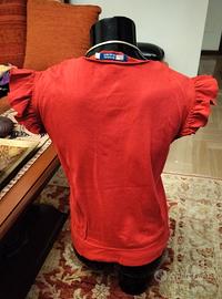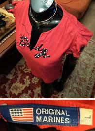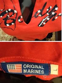 T-shirt ORIGINAL MARINES smanicata con volant al posto delle maniche .Scollo a V.Taglia L.Dimensioni : 38 cm larghezza spalle, sotto ascelle 54 cm,lunghezza totale 58 cm.Cotone 100%>Di colore rosso con bella stampa glitterata con stelle bianche e scritta bianca Original marines sul seno .Etichetta del brand presente nella parte interna,alla base della nuca e sul fianco sinistro all'altezza della vita .Ottime condizioni.Possibile consegna a mano ad Arcore,Monza,Sesto e Milano.