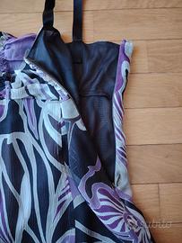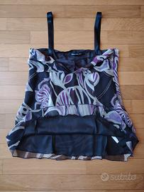 Vendo top della pennyblack con ricami bianchi e viola. Usato letteralmente una volta, non presenta nessun danno. Top in seta veramente di qualità.In lunghezza, nella parte più superiore misura dai 35 ai 36 cm, mentre nella parte più inferiore misura dai 50 ai 51 cm; infine in lunghezza misura dai 43 ai 45 cm.