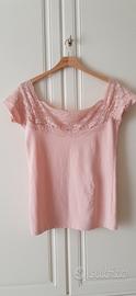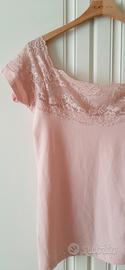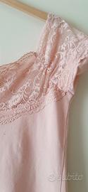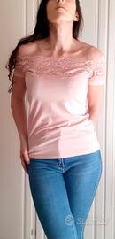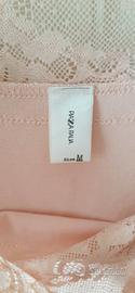 Top rosa cipria Piazza Italia Taglia M 42 italiana, modello aderente in nylon ed elastan molto romantico con le spalle scoperte e la parte sopra il seno tutta in pizzo.