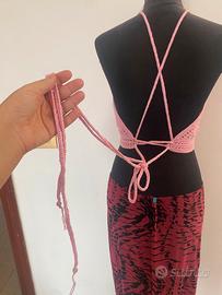 Top/crop top fatto mano, taglia S colore rosa con perline di quarzo rosa come terminale dei laccetti (lunghezza lacci di circa 130cm). Per le misure vedere foto di riferimento.