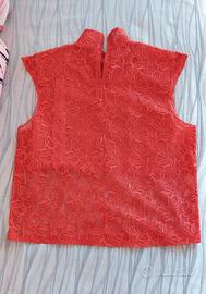 Elegante top francese senza maniche in pizzo rosso con motivo floreale. Collo alto con apertura sul retro, tessuto trasparente e raffinato. Perfetto per occasioni speciali o per dare un tocco chic a un look casual. Vestibilità comoda e femminile. Fabbricato in Francia, probabilmente a Parigi, pezzo unico o edizione limitata.