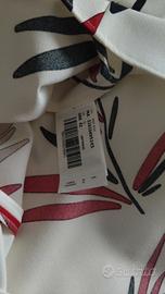 Modello raffinato con stampa floreale nei toni del rosso, nero e beige su fondo avorio.