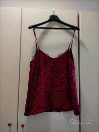 Top sottogiacca rosso fantasia animalier, bordato in pizzo sullo scollo. Lunghezza cm.49 + spallini, larghezza cm.42.