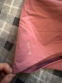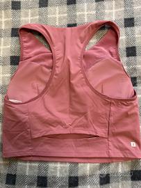 Top sportivo Domyos colore rosa, ideale per palestra, yoga o allenamenti leggeri. Modello lungo con schiena sportiva e inserti traspiranti. Con coppe removibili. In ottime condizioni, usato pochissimo. Tessuto elastico e confortevole.