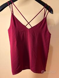 Top da donna Stradivarius realizzato in tessuto leggero, di colore bordeaux. Il modello presenta spalline sottili con incrocio sul retro e scollo a V sul davanti. Linea morbida con vestibilità fluida.