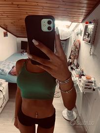 Top verde, condizioni perfette, con spalline che si incrociano dietro la schiena, con imbottitura sul davanti, molto comodo e abbinabile con tutto.