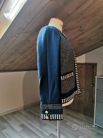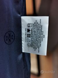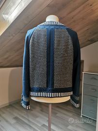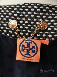 Giacchetta Tory Burch blu marino con incroci bianchi e beige chiaro. Giacca che mantiene molto bene il calore, adatta a cambi di stagione. Chiusura a ganci sul davanti. Acquistato ma mai indossato, veste una taglia italiana 42, UK 8.