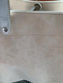 Borsa tote firmata Donna Karan, Motivo monogramma tono su tono. Manici in pelle bianca.